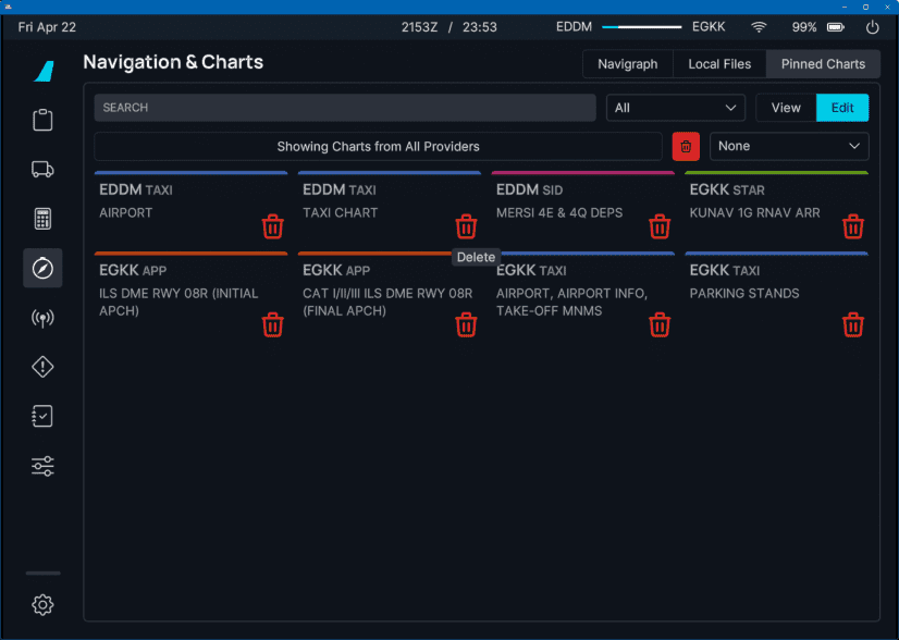 After authenticating, you will have access to the Navigraph page where you can list available charts for airports, view and pin them, etc. See the list of controls below.