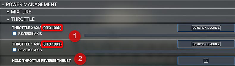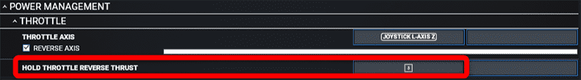 Alternatively, you can use TOGGLE THROTTLE REVERSE THRUST to use a button or key to activate reverse thrust. While this is active, you can push the throttle forward to increase reverse thrust. To deactivate reverse thrust, you need to press the mapped key/button again.