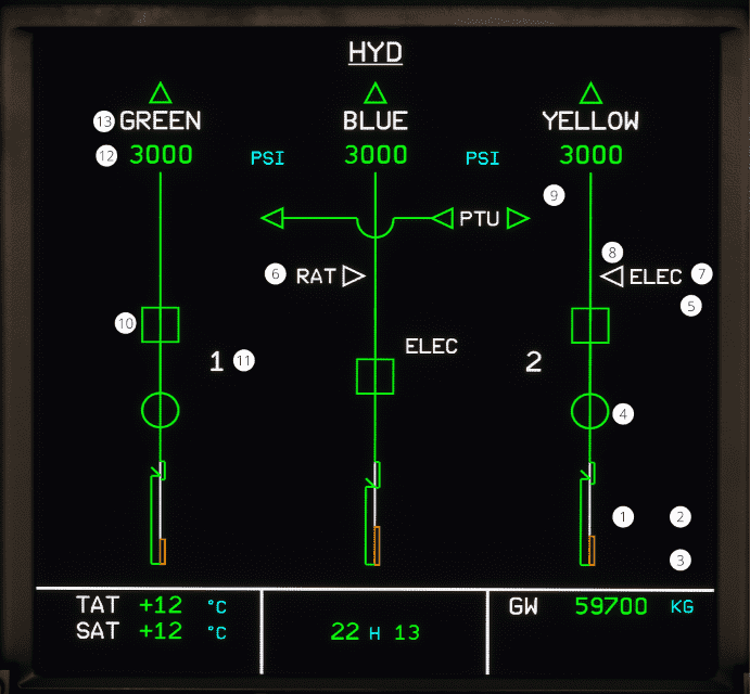 | 9 | PTU | Green outbound arrow | The PTU switch is in AUTO and is not transferring pressure. |