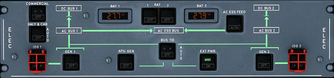 - Switches off all aircraft commercial electrical loads.