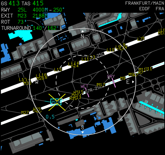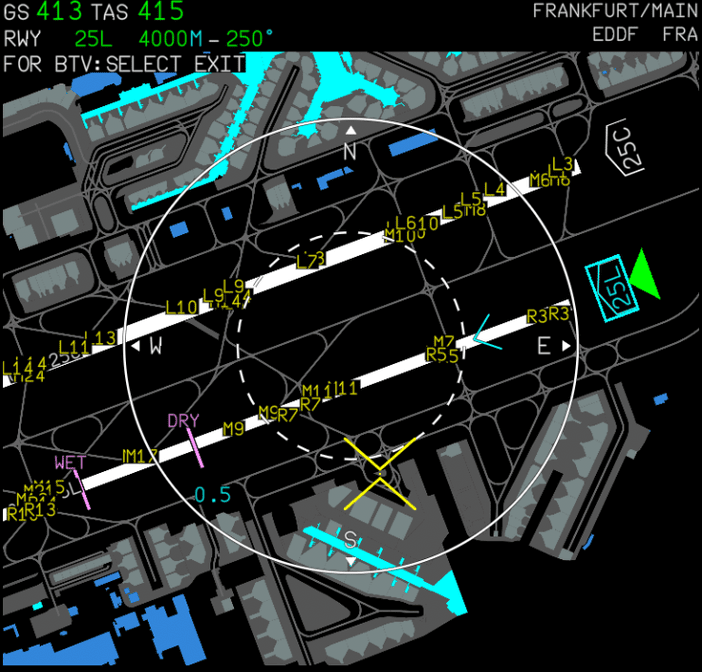 After selecting a runway, OANS displays two magenta lines projecting the required minimal stopping distance for DRY and WET conditions. The targeted exit should be chosen after the WET line only, this provides a safety margin. To finalize the selection, the runway exit is selected by clicking on the corresponding label. The upper left of the ND now shows: