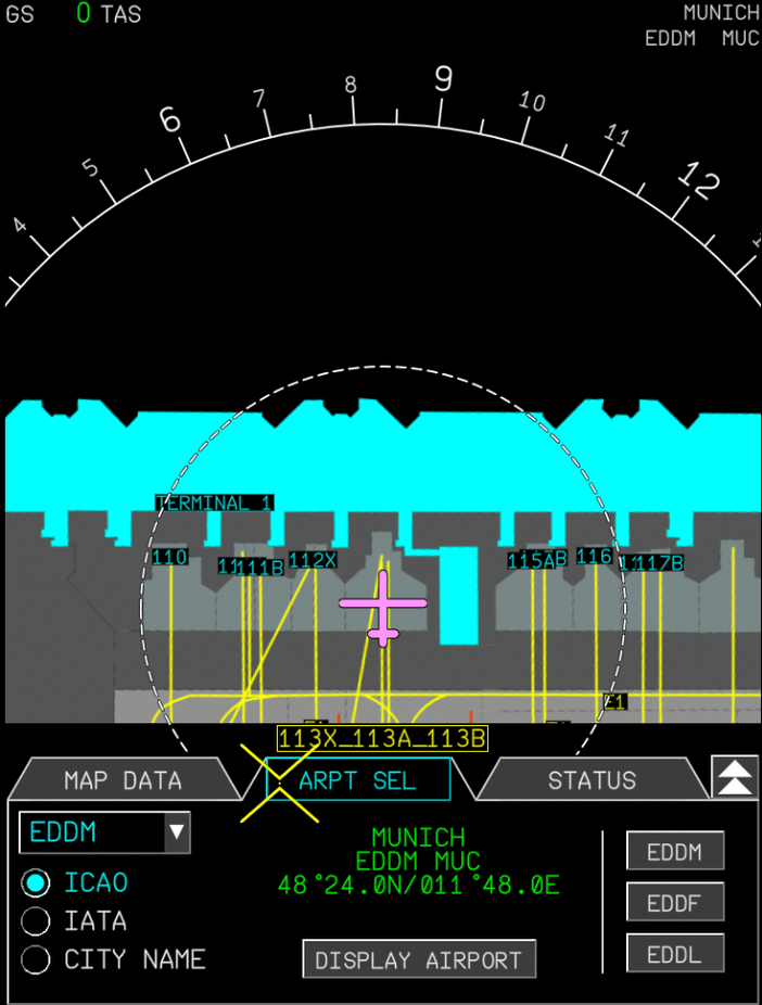 On the ground at the departure airport, the airport map should be loaded automatically. Airports can be selected manually through the OANS control panel, which can be opened via the arrow button on the lower right of the ND. After selection of an airport, a click on "DISPLAY AIRPORT" loads the airport map.