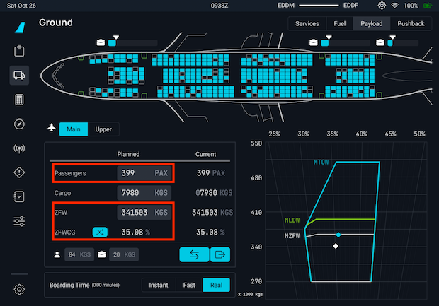 Once boarding has started with the appropriate number of passengers set in the EFB, using the payload window, you can find the ZFW, ZFWCG and PAX as highlighted below.