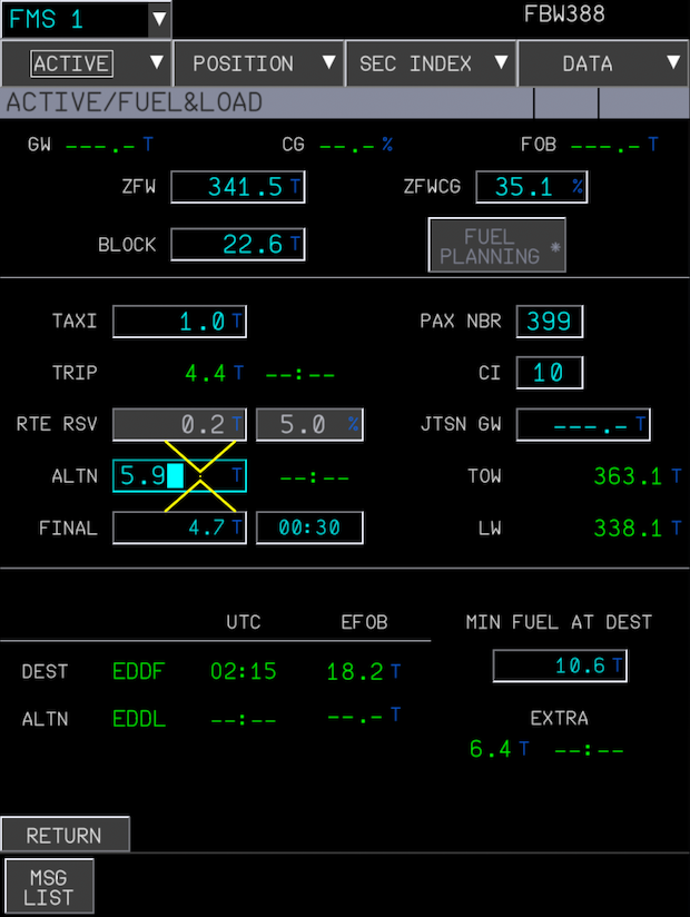 Return to the INIT page on the FMS and select the FUEL&LOAD button to open the FUEL&LOAD page where we will fill in the different values for ZFW, ZFWCG, BLOCK, TAXI, PAX NBR, ALTN and FINAL.