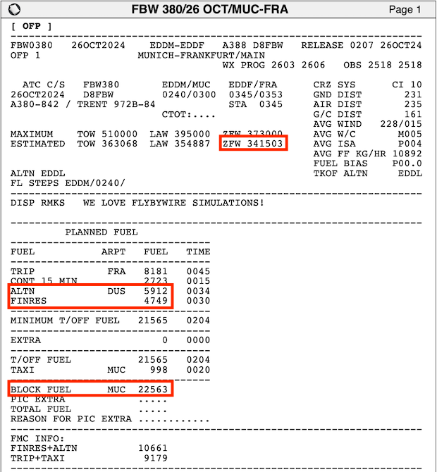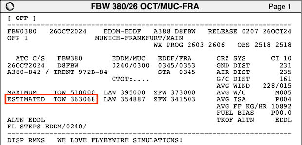 These values can be found in the OFP as shown below. Note that ZFW can also be found on the EFB once passengers start boarding.