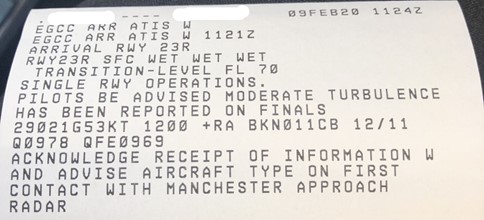 As you can see, this is information W, Whiskey for Manchester, UK EGCC. The weather information is written out in a METAR like format, but with the addition of a QFE as well.