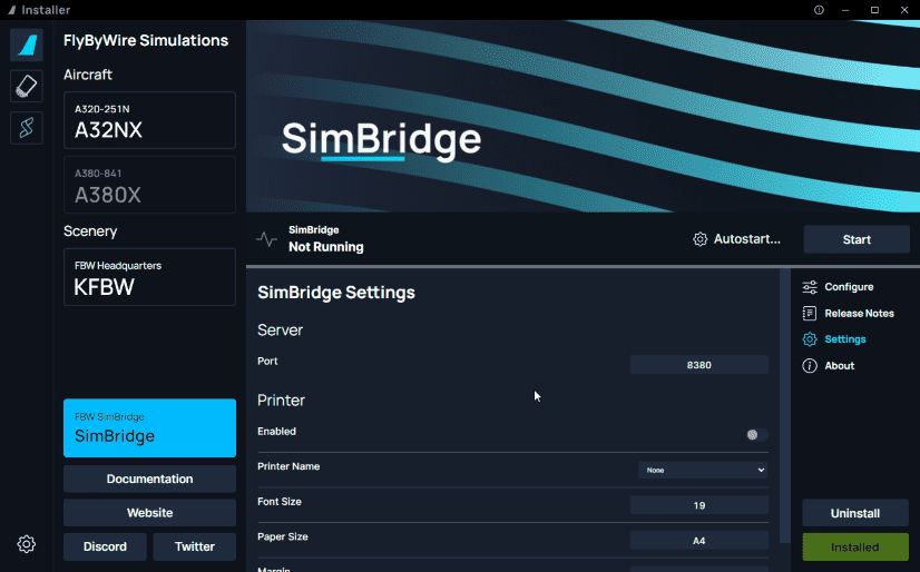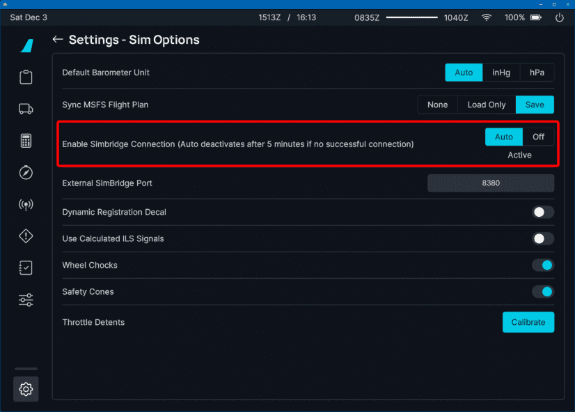 To use the SimBridge, the aircraft's settings need to allow the SimBridge connection.